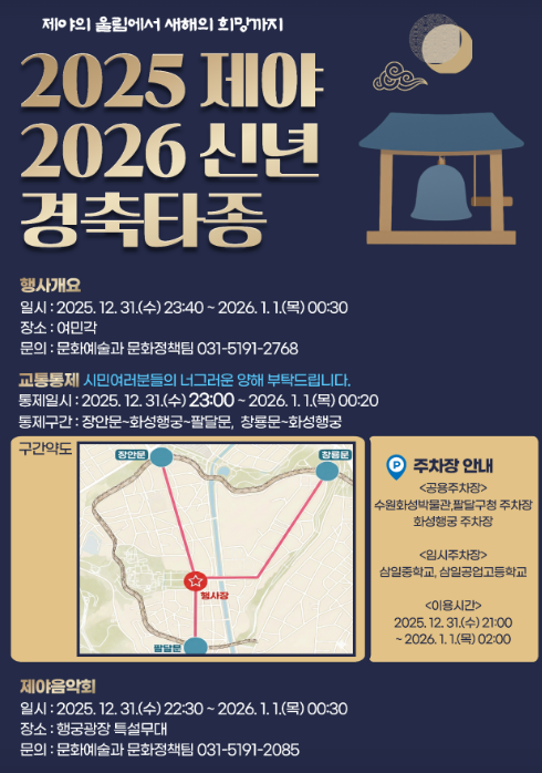 2025년 12월 31일 밤, 수원특례시는 시민과 함께 한 해를 마무리하고 새해를 여는 제야 타종 행사를 진행합니다.